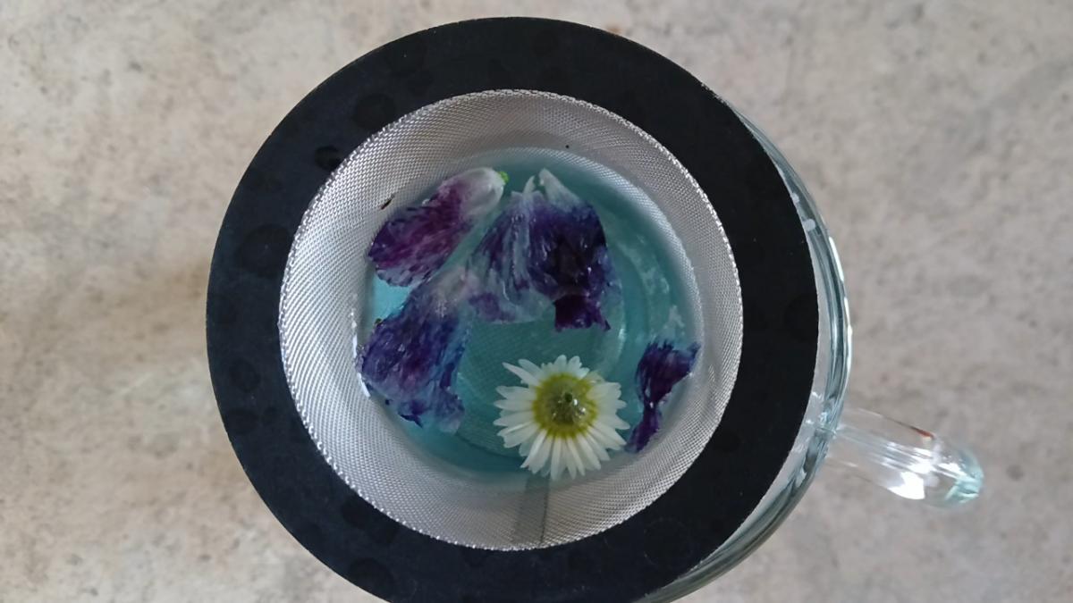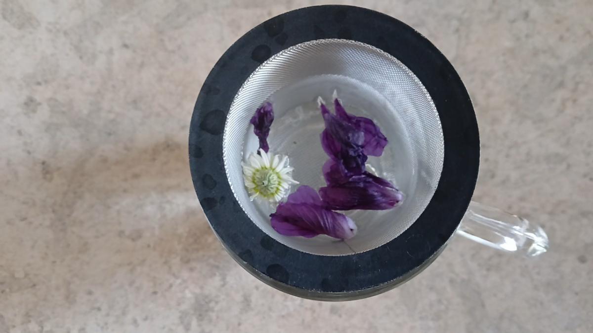 Laisser infuser quelques minutes afin que la mauve libère sa couleur bleue. Vous pouvez avec une cuillère aider à la libération des pigments contenus dans les cellules des pétales. Plus vous mettrez de pétales de mauve plus votre eau sera bleue.